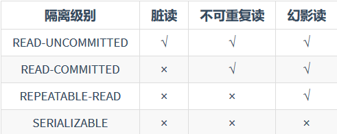 - SERIALIZABLE(可串行化): 最高的隔离级别,完全服从ACID的隔离级别。所有的事务依次逐个执行,这样事务之间就完全不可能产生干扰,也就是说,该级别可以防止脏读、不可重复读以及幻读。