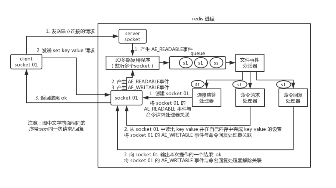 假设此时客户端发送了一个 set key value 请求,此时 redis 中的 socket01 会产生 AE_READABLE 事件,IO 多路复用程序将 socket01 压入队列,此时事件分派器从队列中获取到 socket01 产生的 AE_READABLE 事件,由于前面 socket01 的 AE_READABLE 事件已经与命令请求处理器关联,因此事件分派器将事件交给命令请求处理器来处理。命令请求处理器读取 socket01 的 key value 并在自己内存中完成 key value 的设置。操作完成后,它会将 socket01 的 AE_WRITABLE 事件与命令回复处理器关联。