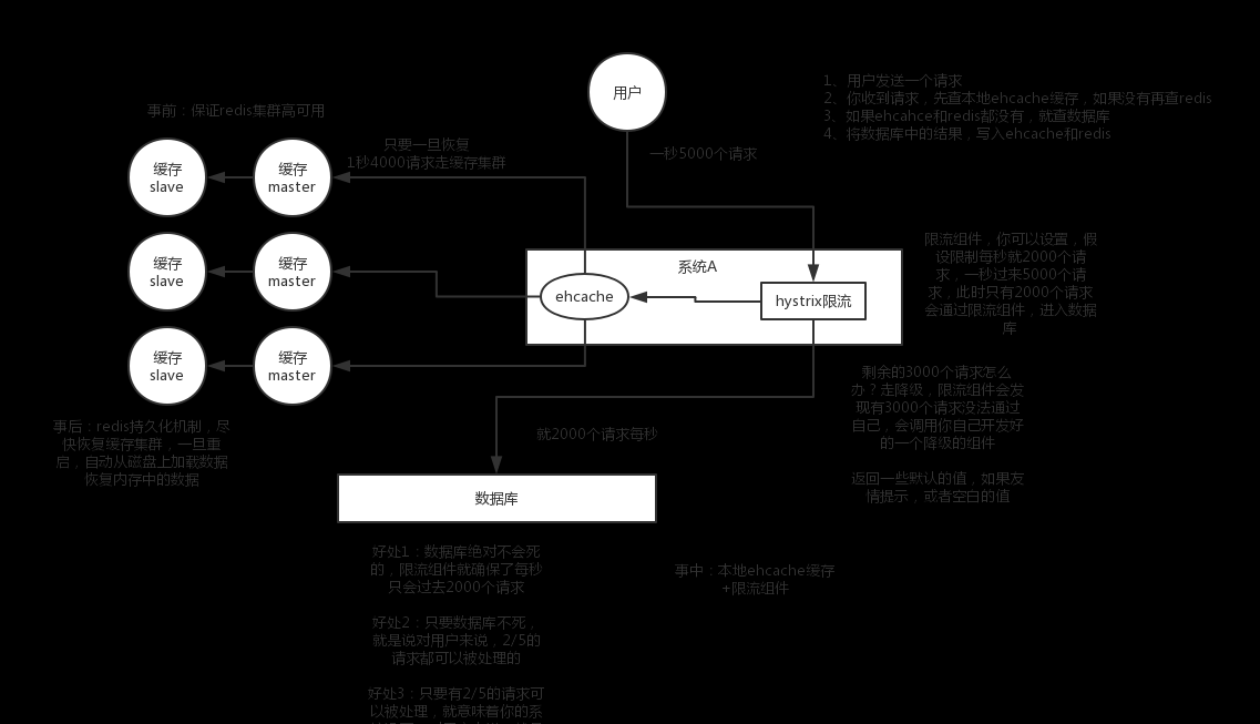 事中:本地ehcache缓存 + hystrix限流&降级,避免MySQL崩掉