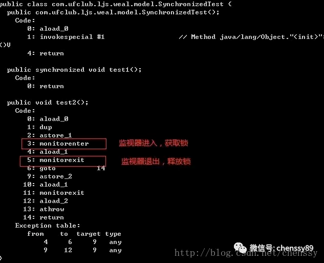 同步代码块:monitorenter指令插入到同步代码块的开始位置,monitorexit指令插入到同步代码块的结束位置,JVM需要保证每一个monitorenter都有一个monitorexit与之相对应。任何对象都有一个monitor与之相关联,当且一个monitor被持有之后,他将处于锁定状态。线程执行到monitorenter指令时,将会尝试获取对象所对应的monitor所有权,即尝试获取对象的锁;