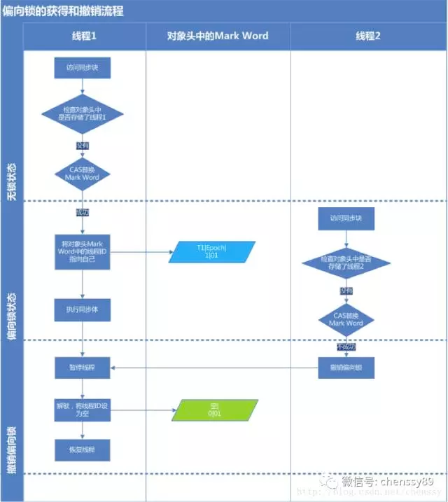 上面提到了轻量级锁的加锁解锁操作是需要依赖多次CAS原子指令的。那么偏向锁是如何来减少不必要的CAS操作呢?我们可以查看Mark word的结构就明白了。只需要检查是否为偏向锁、锁标识为以及ThreadID即可,处理流程如下: