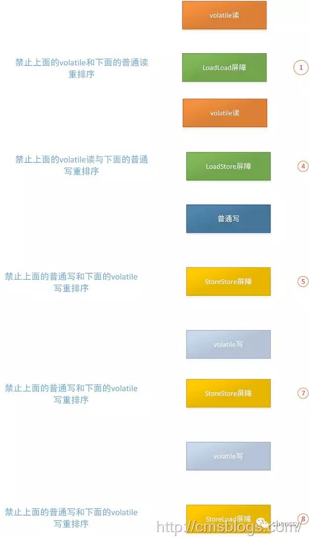 - 当第二个操作为volatile写是,则不管第一个操作是啥,都不能重排序。这个操作确保volatile写之前的操作不会被编译器重排序到volatile写之后;