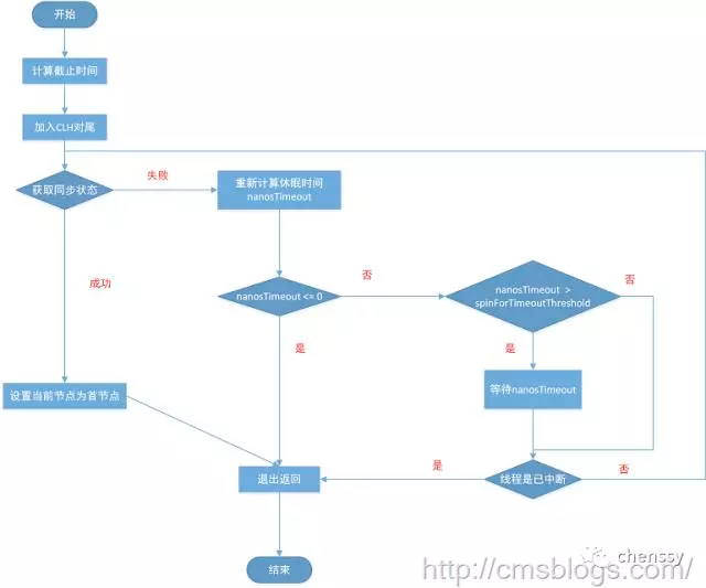 }针对超时控制,程序首先记录唤醒时间deadline ,deadline = System.nanoTime() + nanosTimeout(时间间隔)。如果获取同步状态失败,则需要计算出需要休眠的时间间隔nanosTimeout(= deadline – System.nanoTime()),如果nanosTimeout <= 0 表示已经超时了,返回false,如果大于spinForTimeoutThreshold(1000L)则需要休眠nanosTimeout ,如果nanosTimeout <= spinForTimeoutThreshold ,就不需要休眠了,直接进入快速自旋的过程。原因在于 spinForTimeoutThreshold 已经非常小了,非常短的时间等待无法做到十分精确,如果这时再次进行超时等待,相反会让nanosTimeout 的超时从整体上面表现得不是那么精确,所以在超时非常短的场景中,AQS会进行无条件的快速自旋。