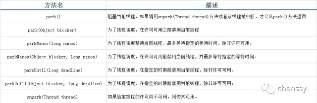 LockSupport定义了一系列以park开头的方法来阻塞当前线程,unpark(Thread thread)方法来唤醒一个被阻塞的线程。如下:
