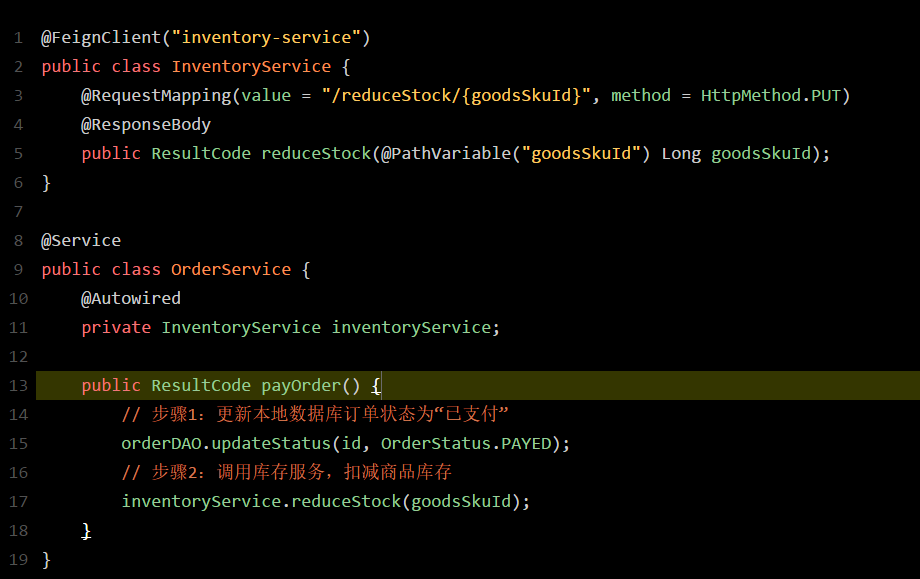 既然如此,那怎么办呢?别急,Feign早已为我们提供好了优雅的解决方案。来看看如果用Feign的话,你的订单服务调用库存服务的代码会变成啥样?