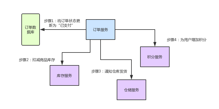 - 用户针对一个订单完成支付之后,就会去找订单服务,更新订单状态