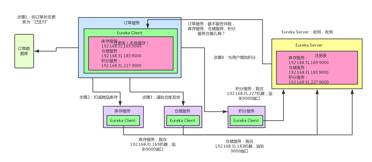 订单服务里也有一个Eureka Client组件,这个Eureka Client组件会找Eureka Server问一下:库存服务在哪台机器啊?监听着哪个端口啊?仓储服务呢?积分服务呢?然后就可以把这些相关信息从Eureka Server的注册表中拉取到自己本地缓存起来。