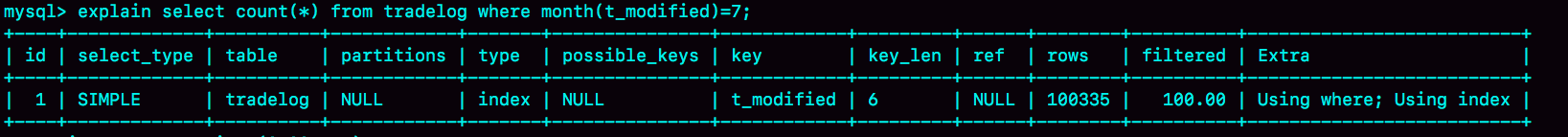 mysql> select count(*) from tradelog where month(t_modified)=7;由于 t_modified 字段上有索引,于是你就很放心地在生产库中执行了这条语句,但却发现执行了特别久,才返回了结果。