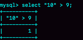 从图中可知,select “10” > 9 返回的是 1,所以你就能确认 MySQL 里的转换规则了:在 MySQL 中,字符串和数字做比较的话,是将字符串转换成数字。
