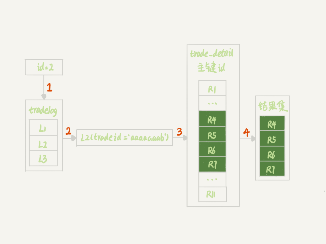 - 第 1 步,是根据 id 在 tradelog 表里找到 L2 这一行;