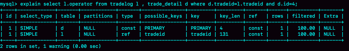 mysql> select d.* from tradelog l, trade_detail d where d.tradeid=l.tradeid and l.id=2; /*语句Q1*/我们一起来看下这个结果: