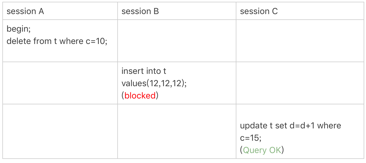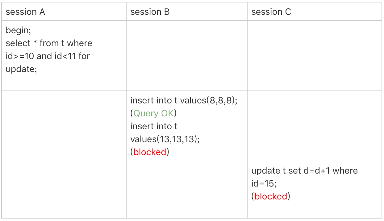 所以,session B 要往这个间隙里面插入 id=8 的记录会被锁住,但是 session C 修改 id=10 这行是可以的。