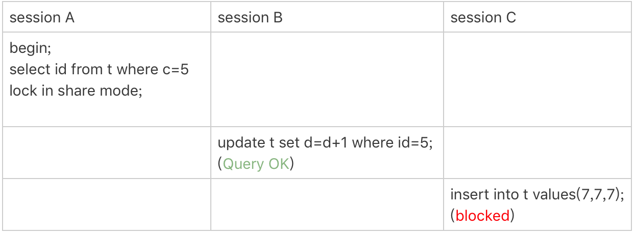 - session A 启动事务后执行查询语句加 lock in share mode,在索引 c 上加了 next-key lock(5,10] 和间隙锁 (10,15);