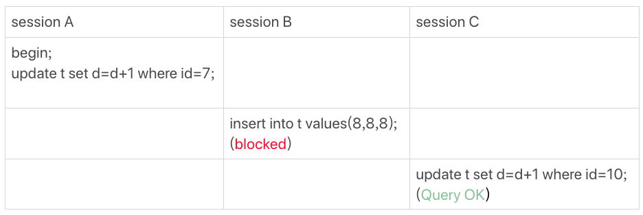 所以从结果上来看,sesson B 要插入(8,8,8) 的这个 insert 语句时就被堵住了。