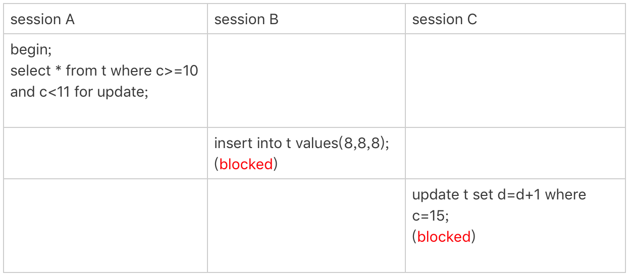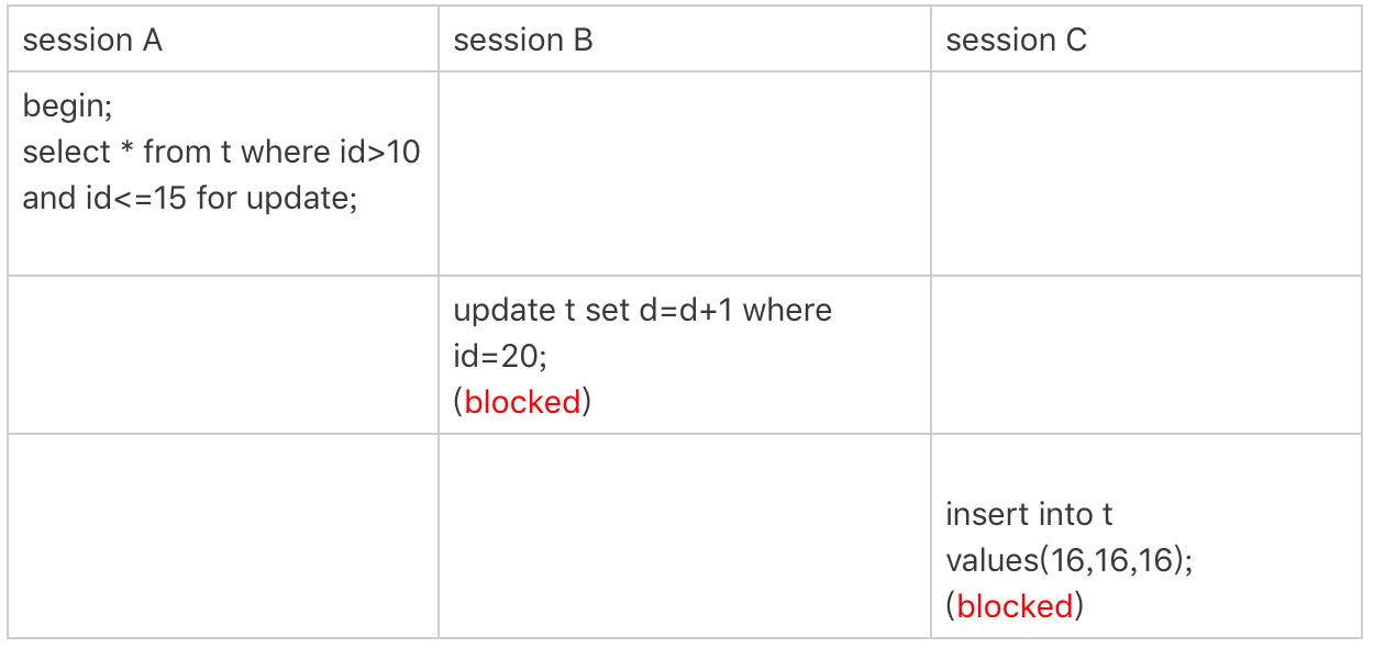所以你看到了,session B 要更新 id=20 这一行,是会被锁住的。同样地,session C 要插入 id=16 的一行,也会被锁住。