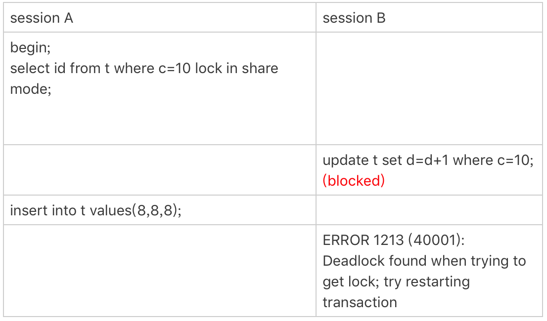 - 然后 session A 要再插入 (8,8,8) 这一行,被 session B 的间隙锁锁住。由于出现了死锁,InnoDB 让 session B 回滚。
