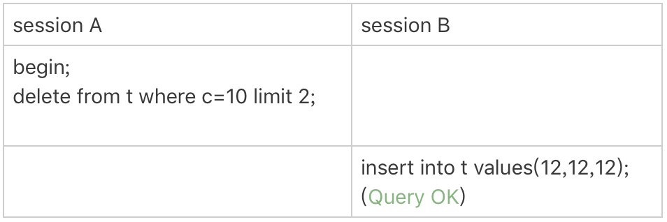 这个例子里,session A 的 delete 语句加了 limit 2。你知道表 t 里 c=10 的记录其实只有两条,因此加不加 limit 2,删除的效果都是一样的,但是加锁的效果却不同。可以看到,session B 的 insert 语句执行通过了,跟案例六的结果不同。