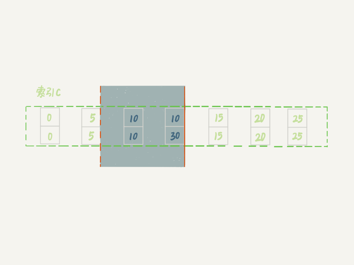 可以看到,虽然有两个 c=10,但是它们的主键值 id 是不同的(分别是 10 和 30),因此这两个 c=10 的记录之间,也是有间隙的。