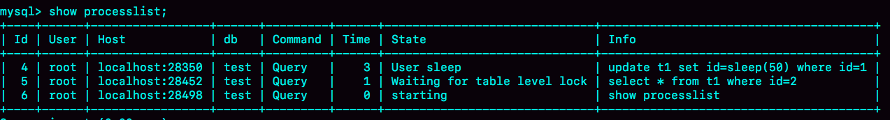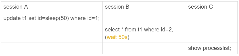 在这个执行序列里,session A 的 update 语句要执行 50 秒,在这个语句执行期间 session B 的查询会进入锁等待状态。session C 的 show processlist 结果输出如下: