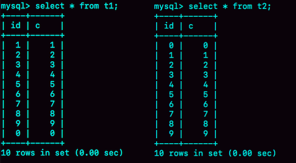 insert into t2 values(1,1),(2,2),(3,3),(4,4),(5,5),(6,6),(7,7),(8,8),(9,9),(0,0);分别执行 select * from t1 和 select * from t2。