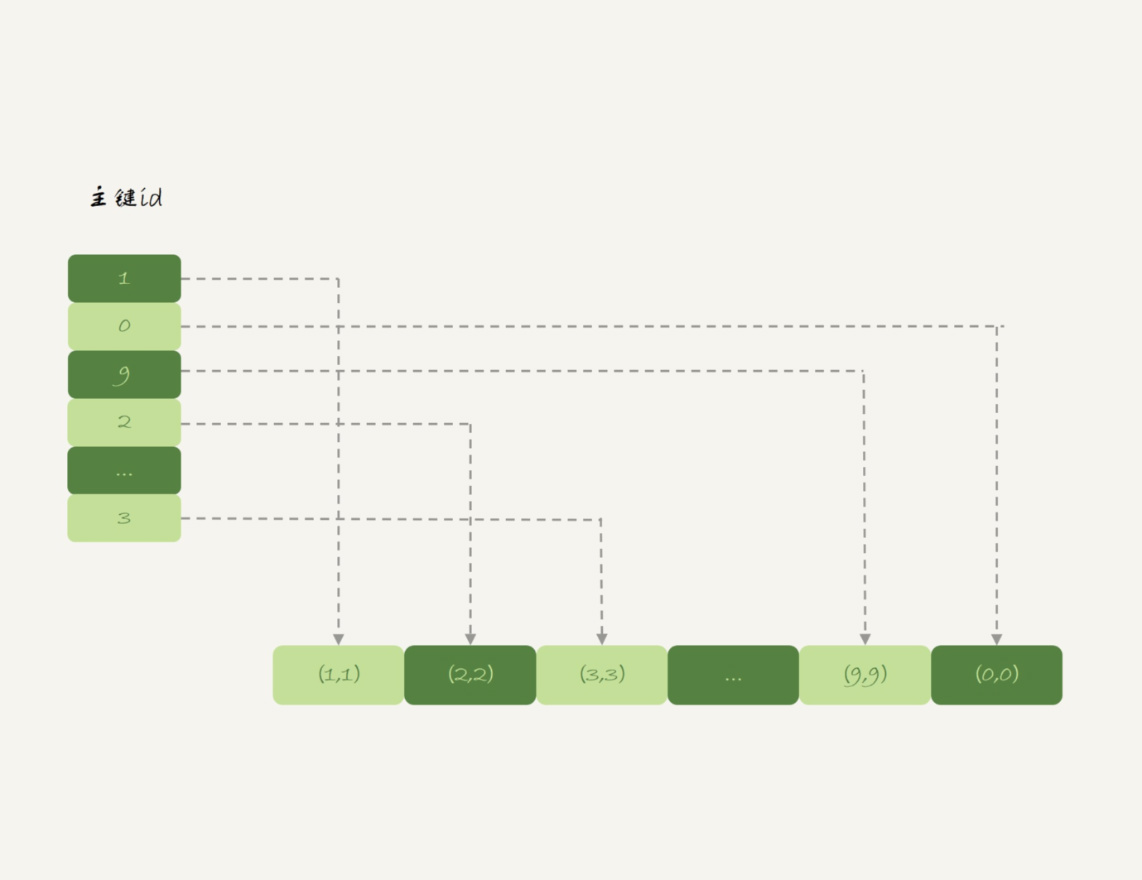 主键索引上的值是有序存储的。在执行 select * 的时候,就会按照叶子节点从左到右扫描,所以得到的结果里,0 就出现在第一行。