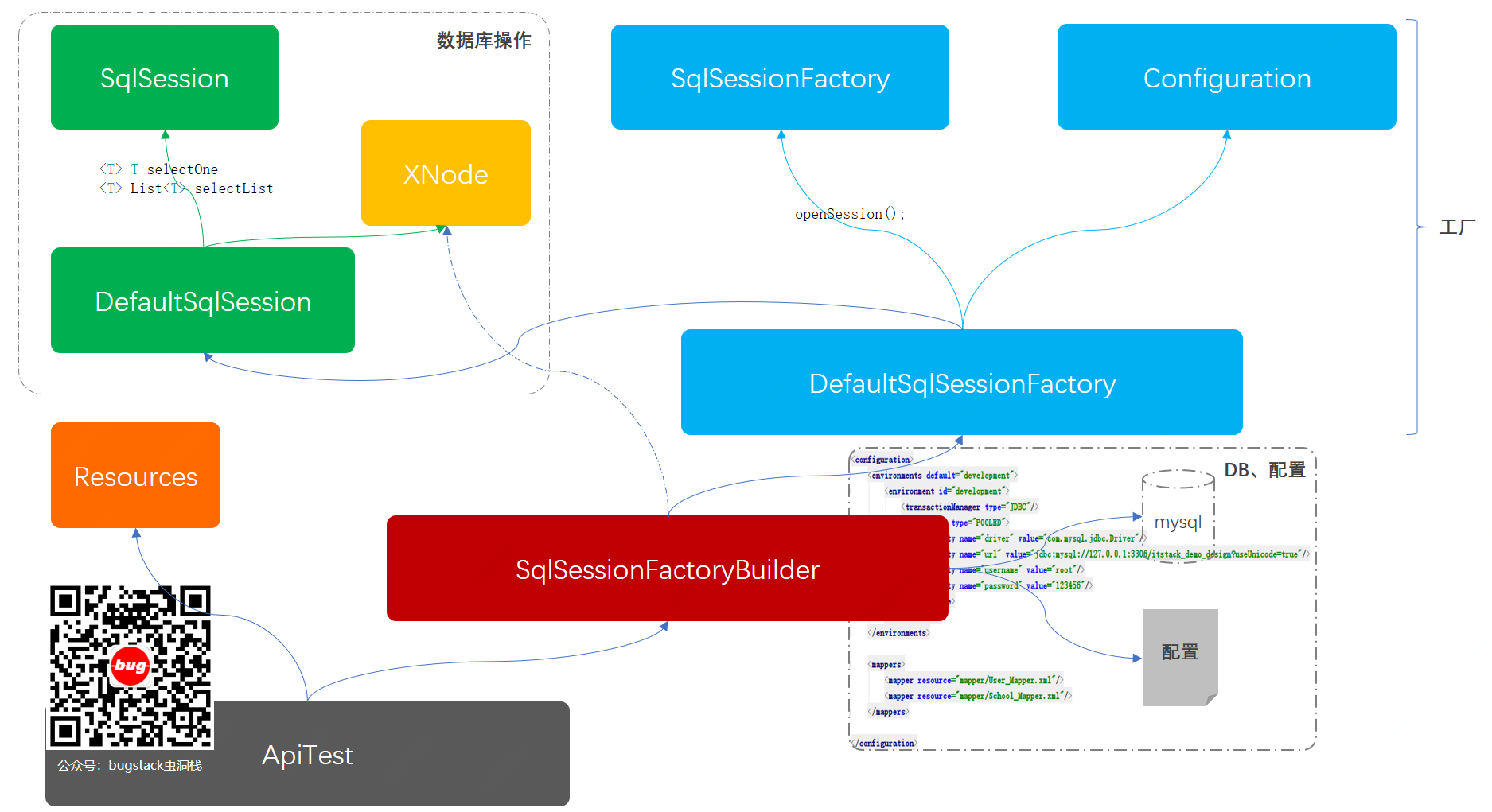 T selectOne、 List selectList等。 - 右侧蓝色部分是对数据库配置的开启session的工厂处理类,这里的工厂会操作DefaultSqlSession