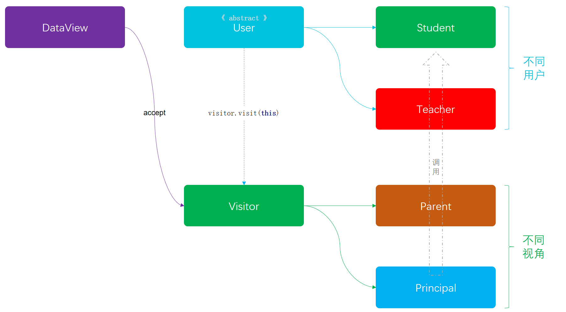 - 说白了访问者模式的核心在于同一个事物不同视角下的访问信息不同。