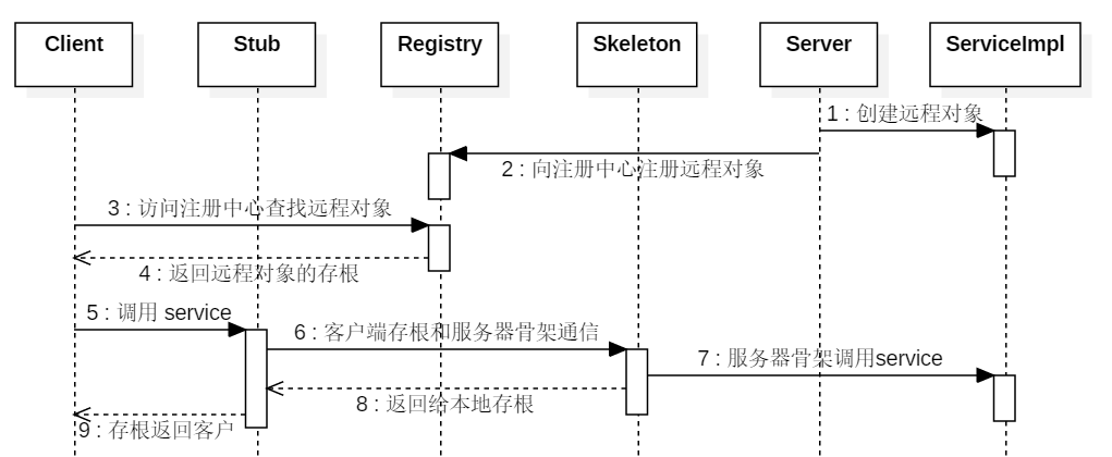 - Server Stub(服务端存根):接收客户端发送的请求并解包,然后调用本地服务进行处理。