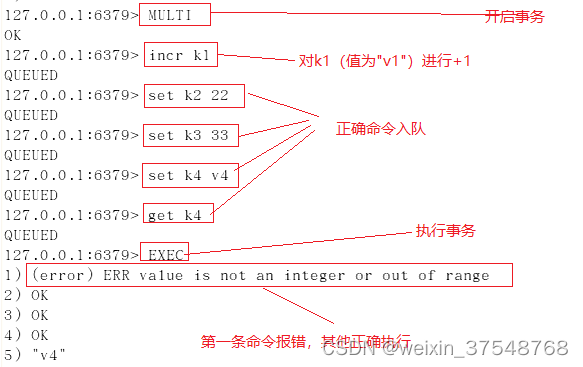 若在事务队列中存在执行性错误(类似于java的1/0的运行时异常),则执行EXEC命令时,其他正确命令会被执行,错误命令抛出异常。