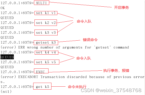 若在事务队列中存在命令性错误(类似于java编译性错误),则执行EXEC命令时,所有命令都不会执行