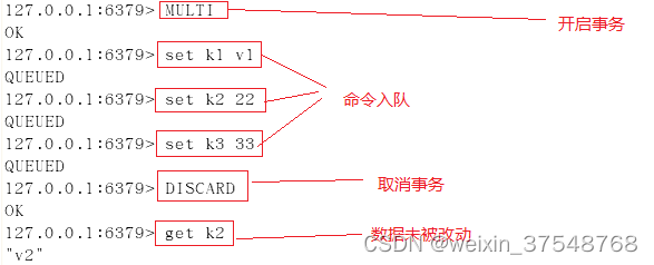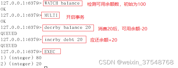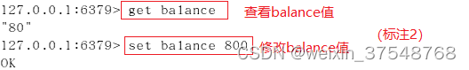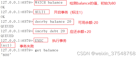 使用watch检测balance,在开启事务后(标注1处),在新窗口执行标注2中的操作,更改balance的值,模拟其他客户端在事务执行期间更改watch监控的数据,然后再执行标注1后命令,执行EXEC后,事务未成功执行。