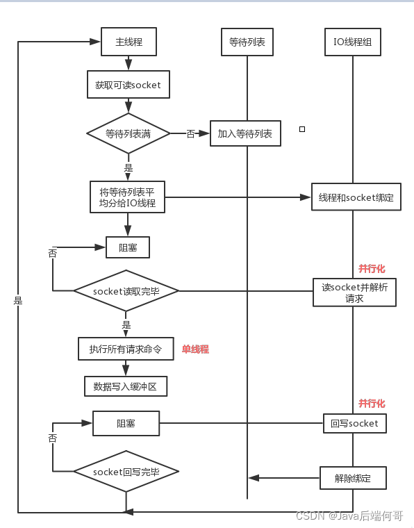 就是任务过来判断等待队列是否满,如果不满就加入等待队列,如果等待队列满了,就平均分给IO线程组处理,主线程阻塞等待IO线程组读socket并解析请求完成,主线程再执行所有请求命令。然后主线程再阻塞等待 IO 线程将数据回写 socket 完毕。