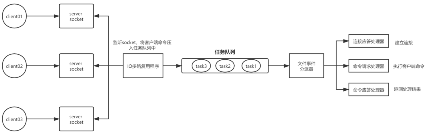 客户端 socket01 向 Redis 进程的 server socket 请求建立连接,此时 server socket 会产生一个 AE_READABLE 事件,IO 多路复用程序监听到 server socket 产生的事件后,将该 socket 压入队列中。文件事件分派器从队列中获取 socket,交给连接应答处理器。连接应答处理器会创建一个能与客户端通信的 socket01,并将该 socket01 后面产生的 AE_READABLE 事件与命令请求处理器关联。