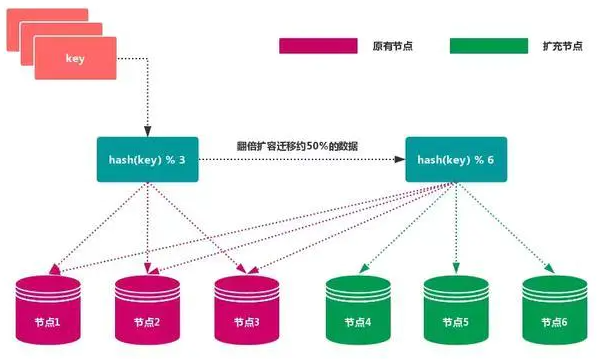 设节点数为 N,写一个数据的时候,根据 hash(key) % N 计算出哈希值,用来决定数据映射到哪一个节点上。