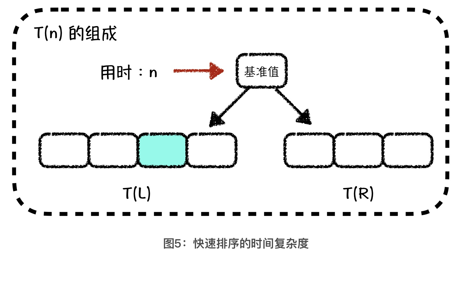 首先,我们要确定总体时间复杂度的公式。我们用 T(n)表示对 n个元素的数组进行快速排序所用的时间,那么 T(n) 中应该包括了单次的 partition 操作用时,以及 parition 操作以后,我们对左右两个子数组分别做快速排序所用的时间,也就是 T(n) = n + T(L) + T(R)。其中 n是单次 partition 操作的用时,T(L)和 T(R)分别是对左右区间进行快速排序的用时,L 和 R分别代表左区间和右区间中元素的数量。