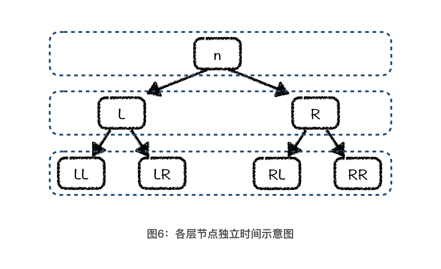 其中,每个节点上的数值代表了这个节点的独立用时。 n = L + R + 1,L = LL + LR + 1, R = RL + RR + 1。这也就意味着,第一层上节点的独立用时总和是 n,第二层上节点的独立用时总和是 L + R = n - 1,第三层上节点的独立用时总和是 LL + LR + RL + RR = n - 3。