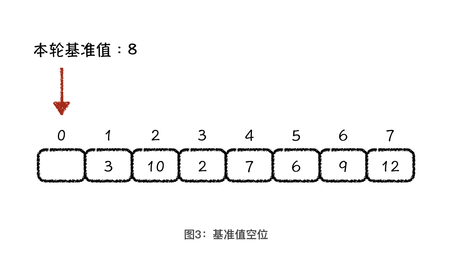 - 先选择一个基准值,一般选择第一个元素,基准值位置空缺;