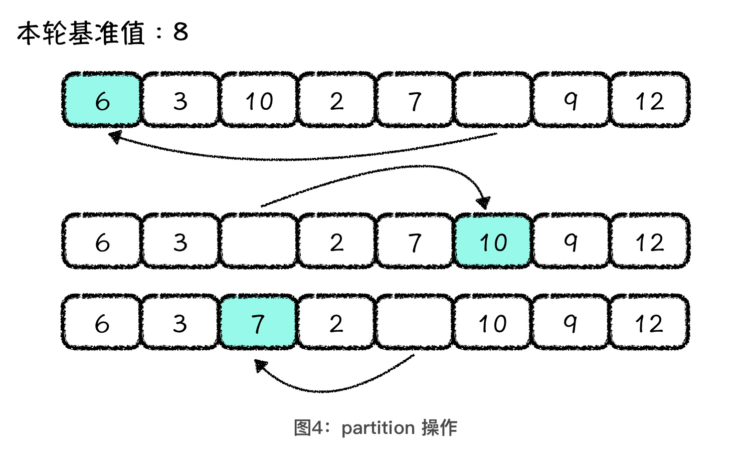 partition 操作简单来说,就是空出一个位置,反复地前后调换元素。