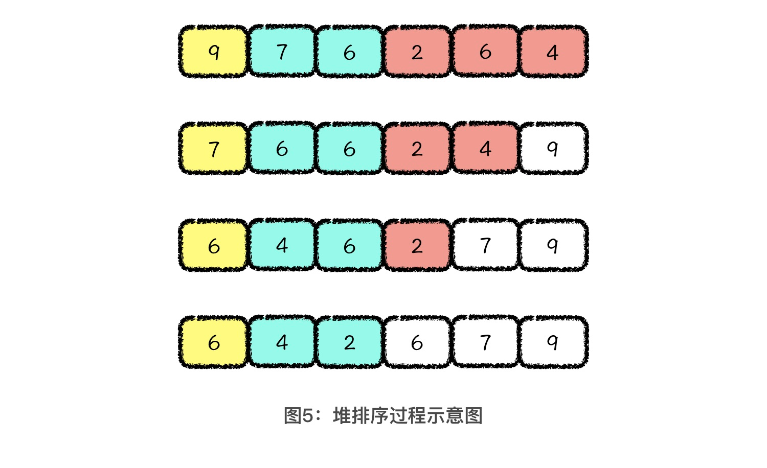 经过三轮弹出大顶堆顶元素的操作以后,原数组中最大的三个值就被放置到了最后三位。当大顶堆中元素弹空时,也就完成了对原数组排序的过程。