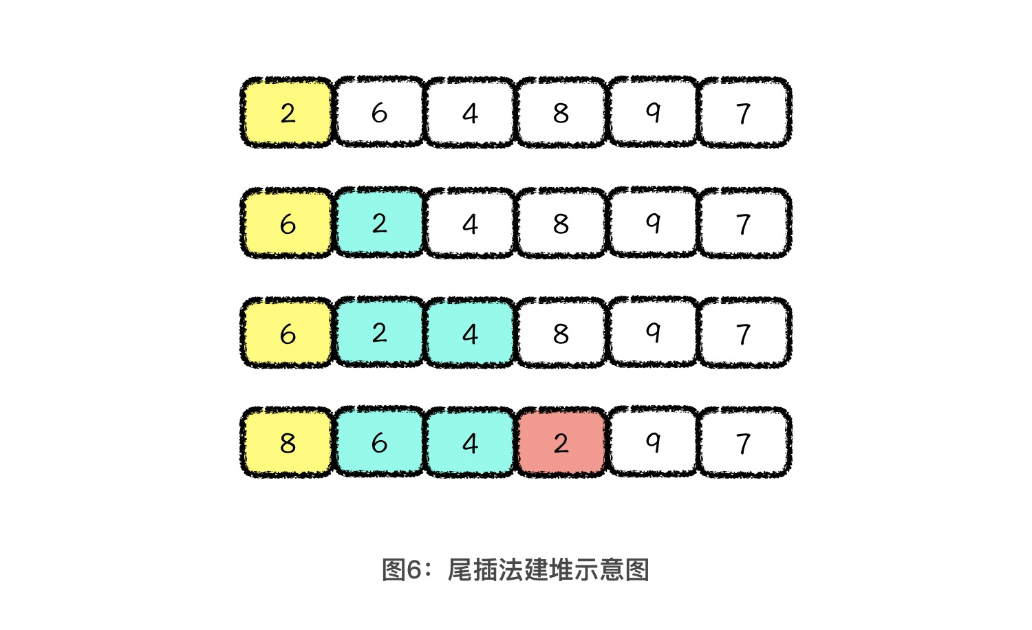一种最直接的方式,就是我们先将原数组分成两部分,前半部分是堆,后半部分是数组中的元素。然后通过堆的向上调整策略,我们依次将后面的元素插入到前面的堆结构中。下图展示的就是用这种尾插法建堆的前三轮数组中的元素情况: