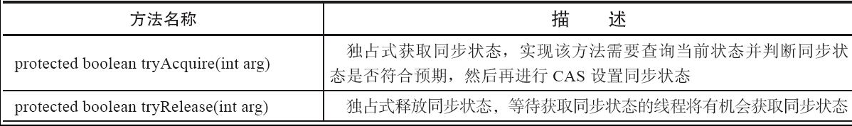同步器的设计是基于模板方法模式的,也就是说,使用者需要继承同步器并重写指定的方法,随后将同步器组合在自定义同步组件的实现中,并调用同步器提供的模板方法,而这些模板方法将会调用使用者重写的方法。