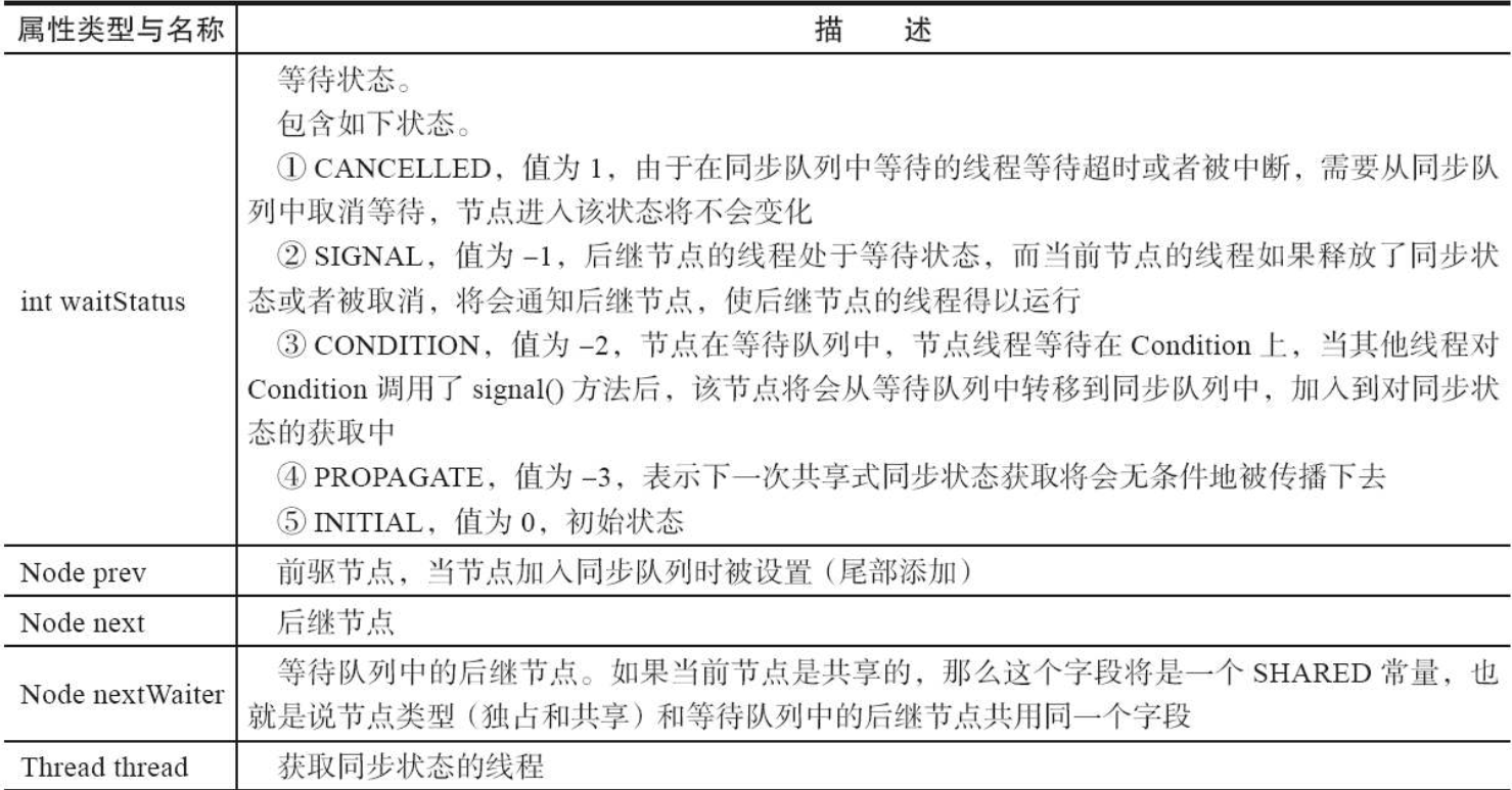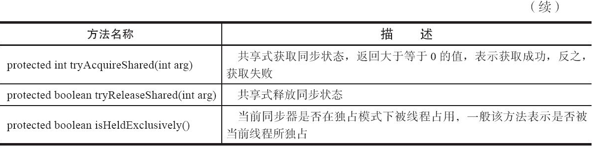 同步器的主要使用方式是继承,子类通过继承同步器并实现它的抽象方法来管理同步状态,在抽象方法的实现过程中免不了要对同步状态进行更改,这时就需要使用同步器提供的3个方法(getState()、setState(int newState)和compareAndSetState(int expect,int update))来进行操作,因为它们能够保证状态的改变是安全的。子类推荐被定义为自定义同步组件的静态内部类,同步器自身没有实现任何同步接口,它仅仅是定义了若干同步状态获取和释放的方法来供自定义同步组件使用,同步器既可以支持独占式地获取同步状态,也可以支持共享式地获取同步状态,这样就可以方便实现不同类型的同步组件(ReentrantLock、ReentrantReadWriteLock和CountDownLatch等)。