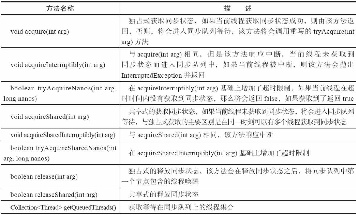 同步器提供的模板方法基本上分为3类:独占式获取与释放同步状态、共享式获取与释放同步状态和查询同步队列中的等待线程情况。自定义同步组件将使用同步器提供的模板方法来实现自己的同步语义。