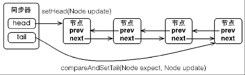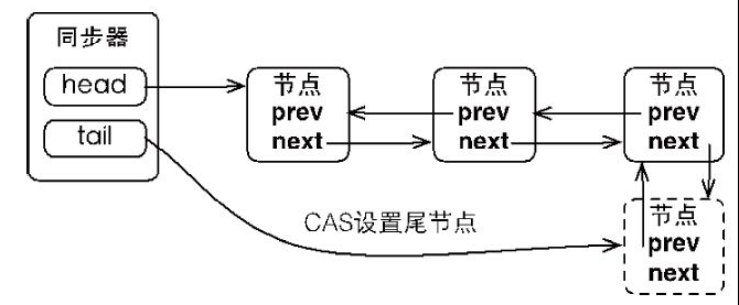 同步器包含了两个节点类型的引用,一个指向头节点,而另一个指向尾节点。试想一下,当一个线程成功地获取了同步状态(或者锁),其他线程将无法获取到同步状态,转而被构造成为节点并加入到同步队列中,而这个加入队列的过程必须要保证线程安全,因此同步器提供了一个基于CAS的设置尾节点的方法:compareAndSetTail(Node expect,Node update),它需要传递当前线程“认为”的尾节点和当前节点,只有设置成功后,当前节点才正式与之前的尾节点建立关联。