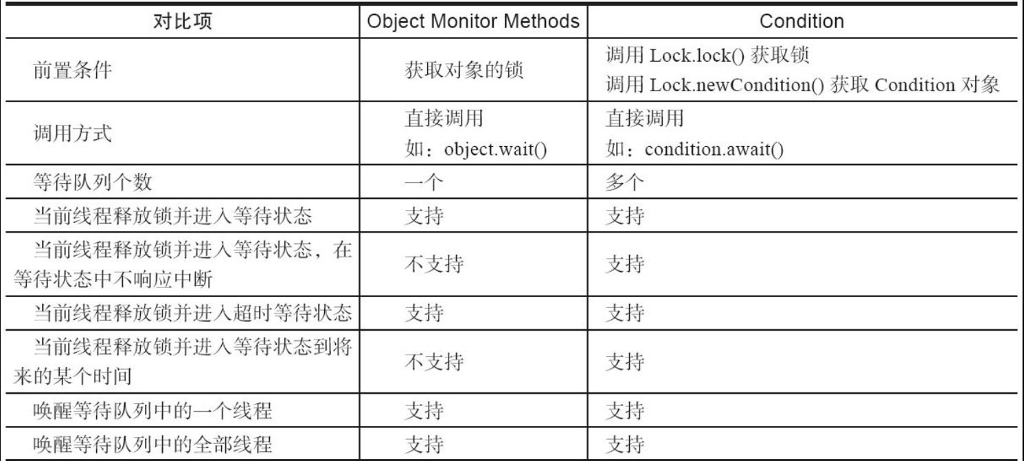 任意一个Java对象,都拥有一组监视器方法(定义在java.lang.Object上),主要包括wait()、wait(long timeout)、notify()以及notifyAll()方法,这些方法与synchronized同步关键字配合,可以实现等待/通知模式。Condition接口也提供了类似Object的监视器方法,与Lock配合可以实现等待/通知模式,但是这两者在使用方式以及功能特性上还是有差别的。