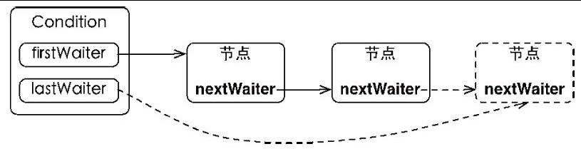 Condition拥有首尾节点的引用,而新增节点只需要将原有的尾节点nextWaiter指向它,并且更新尾节点即可。上述节点引用更新的过程并没有使用CAS保证,原因在于调用await()方法的线程必定是获取了锁的线程,也就是说该过程是由锁来保证线程安全的。