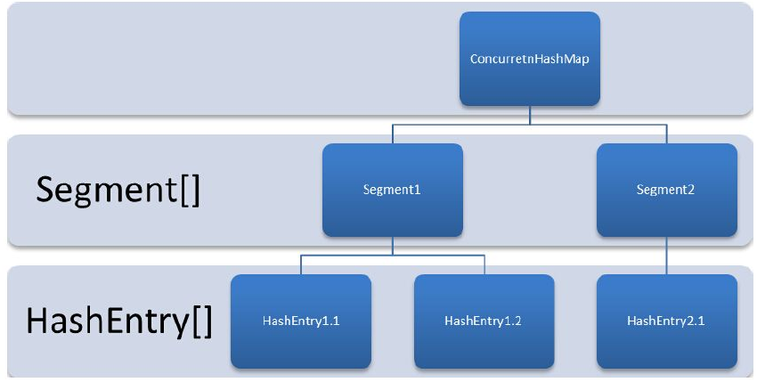 ConcurrentHashMap是由Segment数组结构和HashEntry数组结构组成。Segment是一种可重入锁(ReentrantLock),在ConcurrentHashMap里扮演锁的角色;HashEntry则用于存储键值对数据。一个ConcurrentHashMap里包含一个Segment数组。Segment的结构和HashMap类似,是一种数组和链表结构。一个Segment里包含一个HashEntry数组,每个HashEntry是一个链表结构的元素,每个Segment守护着一个HashEntry数组里的元素,当对HashEntry数组的数据进行修改时,必须首先获得与它对应的Segment锁,
