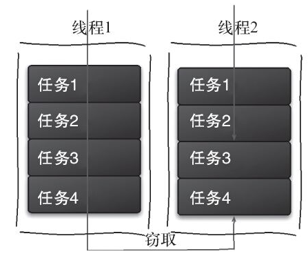 工作窃取(work-stealing)算法是指某个线程从其他队列里窃取任务来执行。那么,为什么需要使用工作窃取算法呢?假如我们需要做一个比较大的任务,可以把这个任务分割为若干互不依赖的子任务,为了减少线程间的竞争,把这些子任务分别放到不同的队列里,并为每个队列创建一个单独的线程来执行队列里的任务,线程和队列一一对应。比如A线程负责处理A队列里的任务。但是,有的线程会先把自己队列里的任务干完,而其他线程对应的队列里还有任务等待处理。干完活的线程与其等着,不如去帮其他线程干活,于是它就去其他线程的队列里窃取一个任务来执行。而在这时它们会访问同一个队列,所以为了减少窃取任务线程和被窃取任务线程之间的竞争,通常会使用双端队列,被窃取任务线程永远从双端队列的头部拿任务执行,而窃取任务的线程永远从双端队列的尾部拿任务执行。