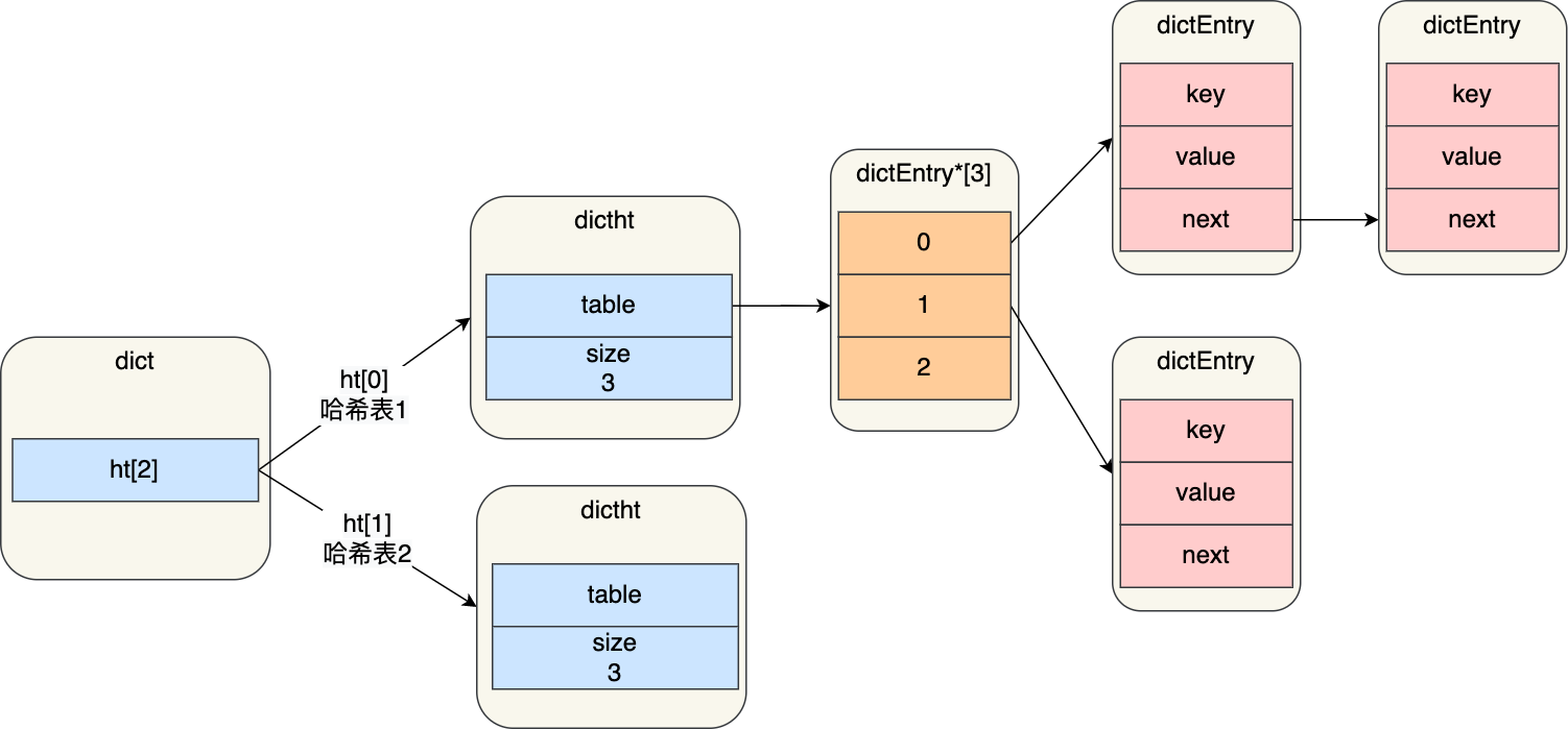 } dict;之所以定义了 2 个哈希表,是因为进行 rehash 的时候,需要用上 2 个哈希表了。