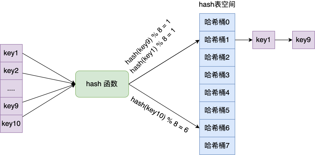 当一个键值对的键经过 Hash 函数计算后得到哈希值,再将(哈希值 % 哈希表大小)取模计算,得到的结果值就是该 key-value 对应的数组元素位置,也就是第几个哈希桶。